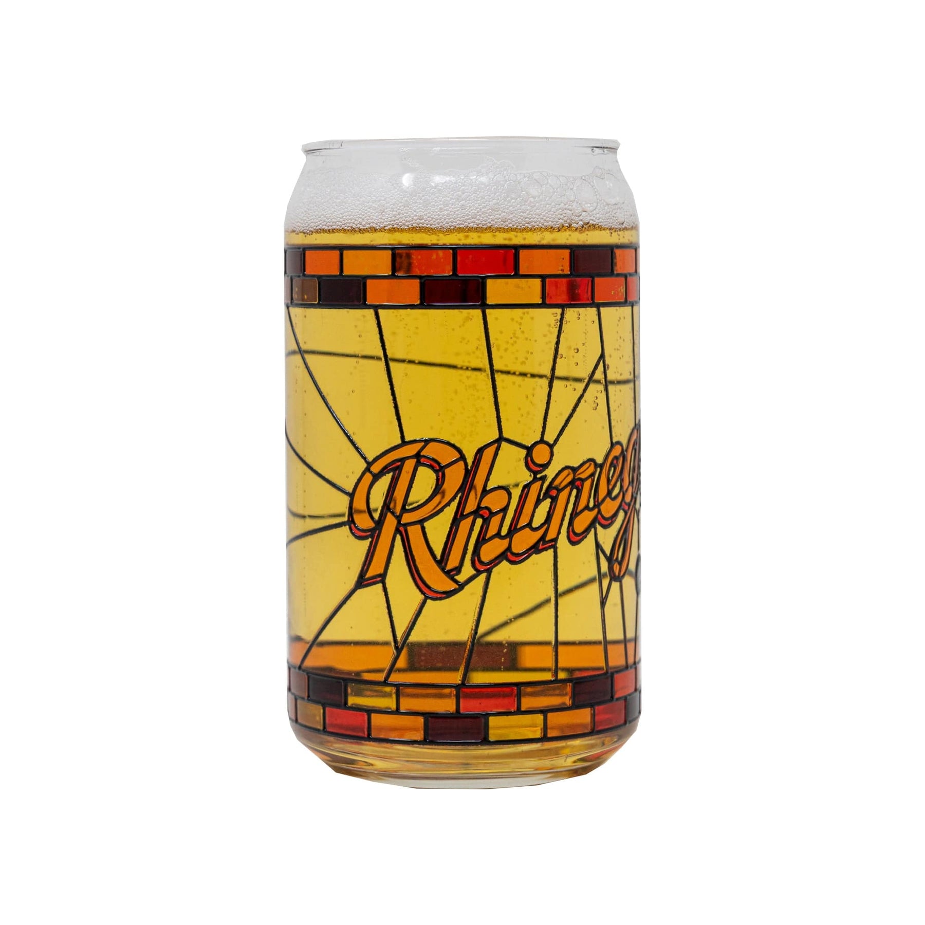 Inspired by the warm glow of a classic dive bar lamp and the familiar hum of a jukebox. This 16oz can glass features bold Rhinegeist lettering framed by a stained glass style design. The black linework is 3D, creating a tactile texture that mimics real stained glass and adds grip. Perfect for long nights, pool games, and beer served with a side of nostalgia.